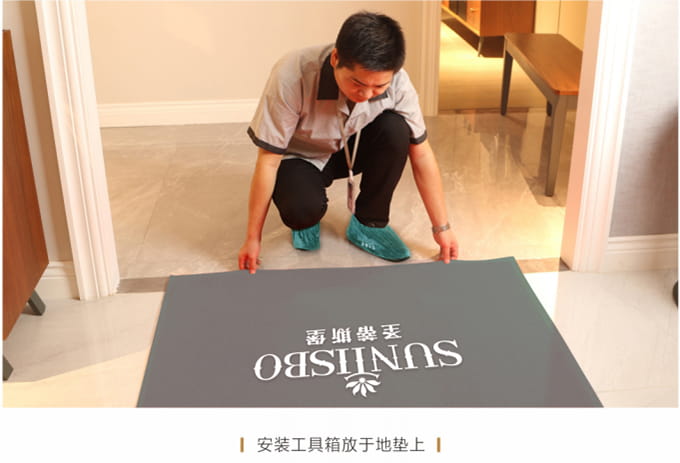 1、搬运之前现在客户家门前放置《圣蒂斯堡安装施工指示牌》,搬运和安装过程中避免发生碰撞和声响,控制说话声音以免惊扰客户家人或碰坏物品。送货安装服务人员在进入顾客家前,应穿上自备的鞋套。