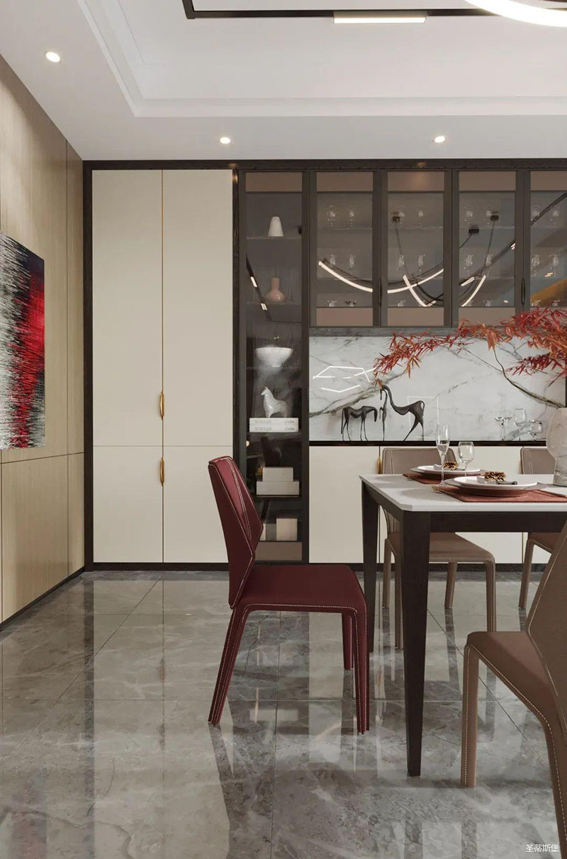 一字型布局的开放空间,强化了餐厨的开阔感,延伸了空间的舒朗视野。纯白调的天然餐桌,与周围空间融为一体,映衬着空间的纯洁美好。意式简约的红色餐椅,线条简洁凌厉到能轻易征服人心,一隅红枫点缀其中,视觉层次感瞬间得到提升,让人于静简和清欢之间,感受人生百味。