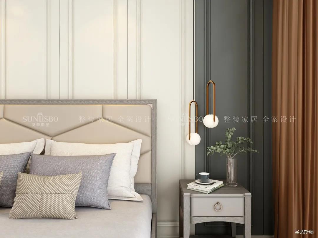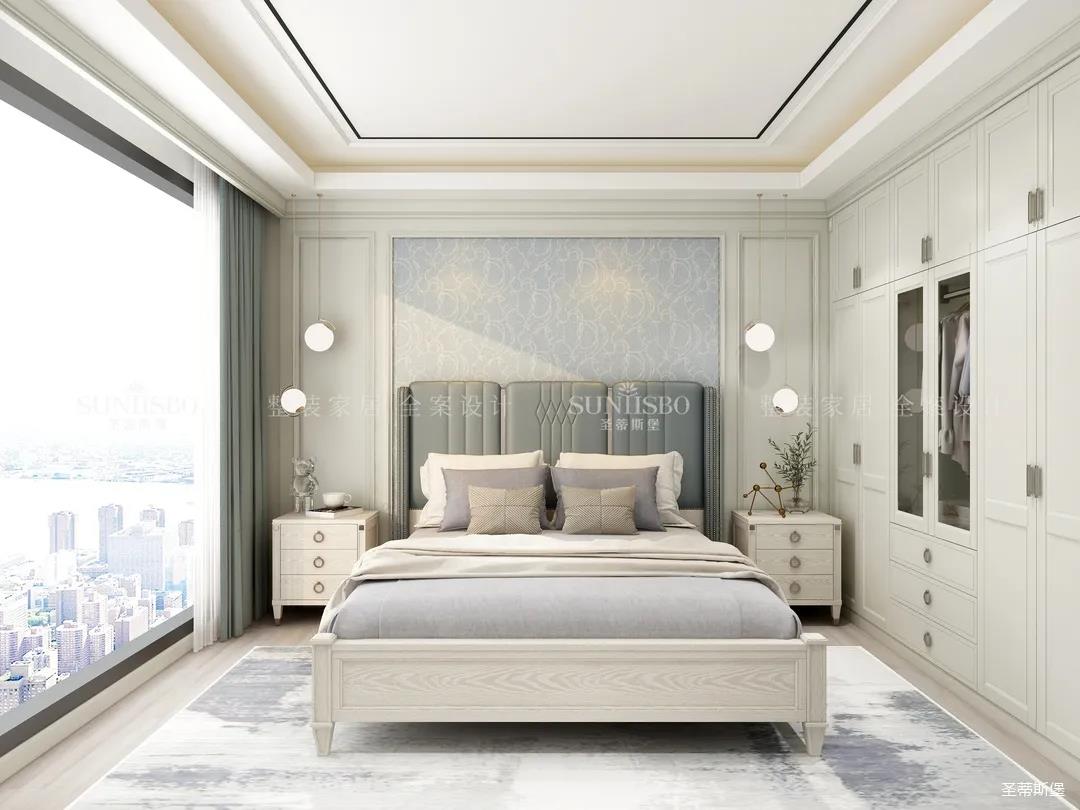 轻盈而明亮的实木饰面与超大落地窗,给次卧空间带来了明朗的空间视野,莫兰迪色彩交叠出最时尚的空间底色。定制衣柜对称开合让空间秩序规律又齐整,护墙选择了浅蓝色打底,虽是美式风格,颜色却没有美式的厚重感,印花贴合着床屏,流线简练利落,以简致的维度诠释着美式雅致的舒适生活。