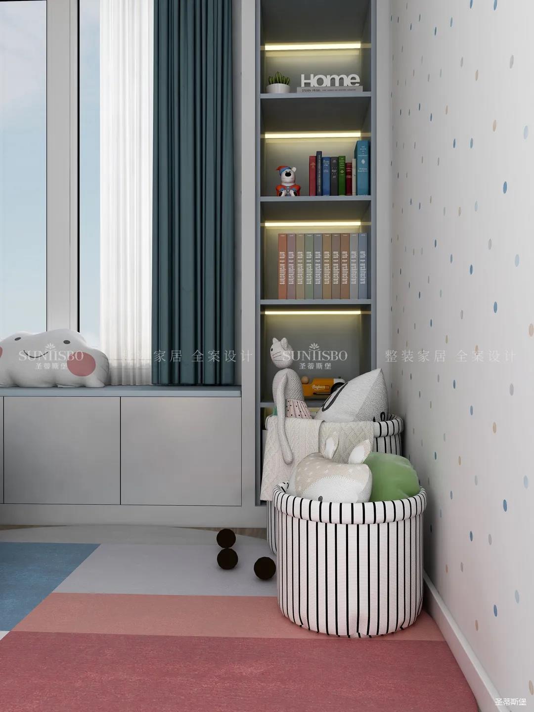 儿童房追求的是童真与自然,柜体的色彩与软装搭配完美呼应,云朵山峰的背景墙,以特立独行的设计在视觉上让心灵得到放空的意境。沿窗打造的飘窗格局,增加空间的功能性,造型简约的柜体根据家装理念摒弃了繁复的设计,更多展现的是空间自然之美。