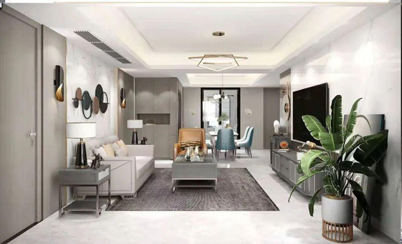 ▲设计师巧妙的运用填充艺术,将客厅电视与沙发背景色彩相呼应,利用凹凸互补的设计手法,传递着空间时尚。莫兰迪实木家具,配以同色系的高级金属底座,将精致轻奢从细节中脱颖而出。