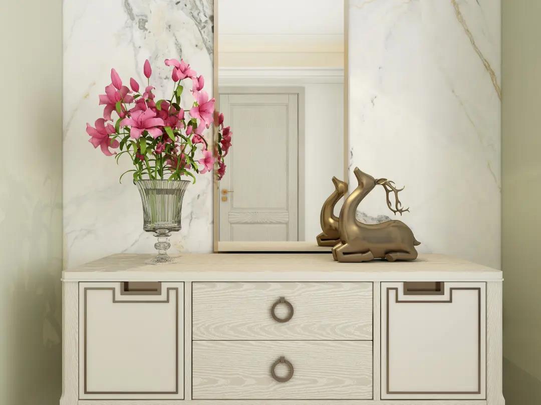 正前方是艺术大理石搭配仿古白移动玄关柜,